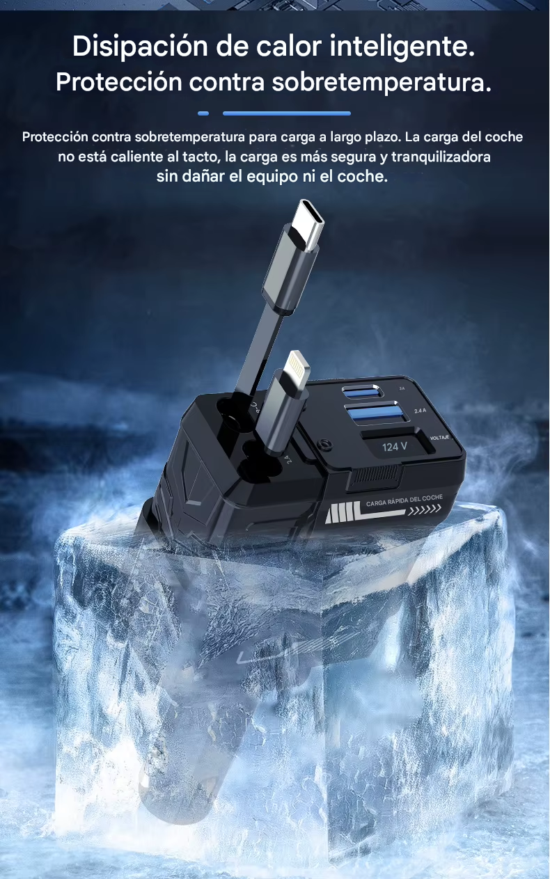 - Cables retráctiles: Cada uno soporta 24W (12V/2A).