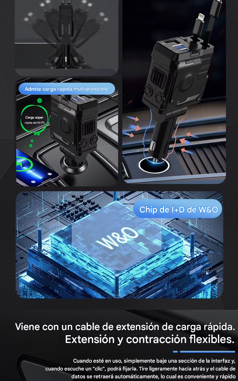 Carga 4 Dispositivos a la Vez: Incluye 2 cables retráctiles y 2 puertos adicionales (USB y USB-C). Perfecto para el conductor, el copiloto y los pasajeros de atrás.