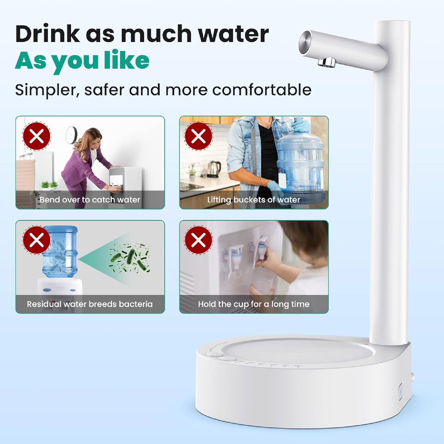 Disfruta de agua fresca con nuestro dispensador inteligente. Configura fácilmente el volumen (100, 200, 300 ml) y detén el flujo cuando quieras. Su diseño portátil y batería USB de larga duración lo hacen perfecto para el hogar o la oficina. Fabricado con plástico ABS y acero inoxidable, es compatible con botellas de 2 a 5 galones.