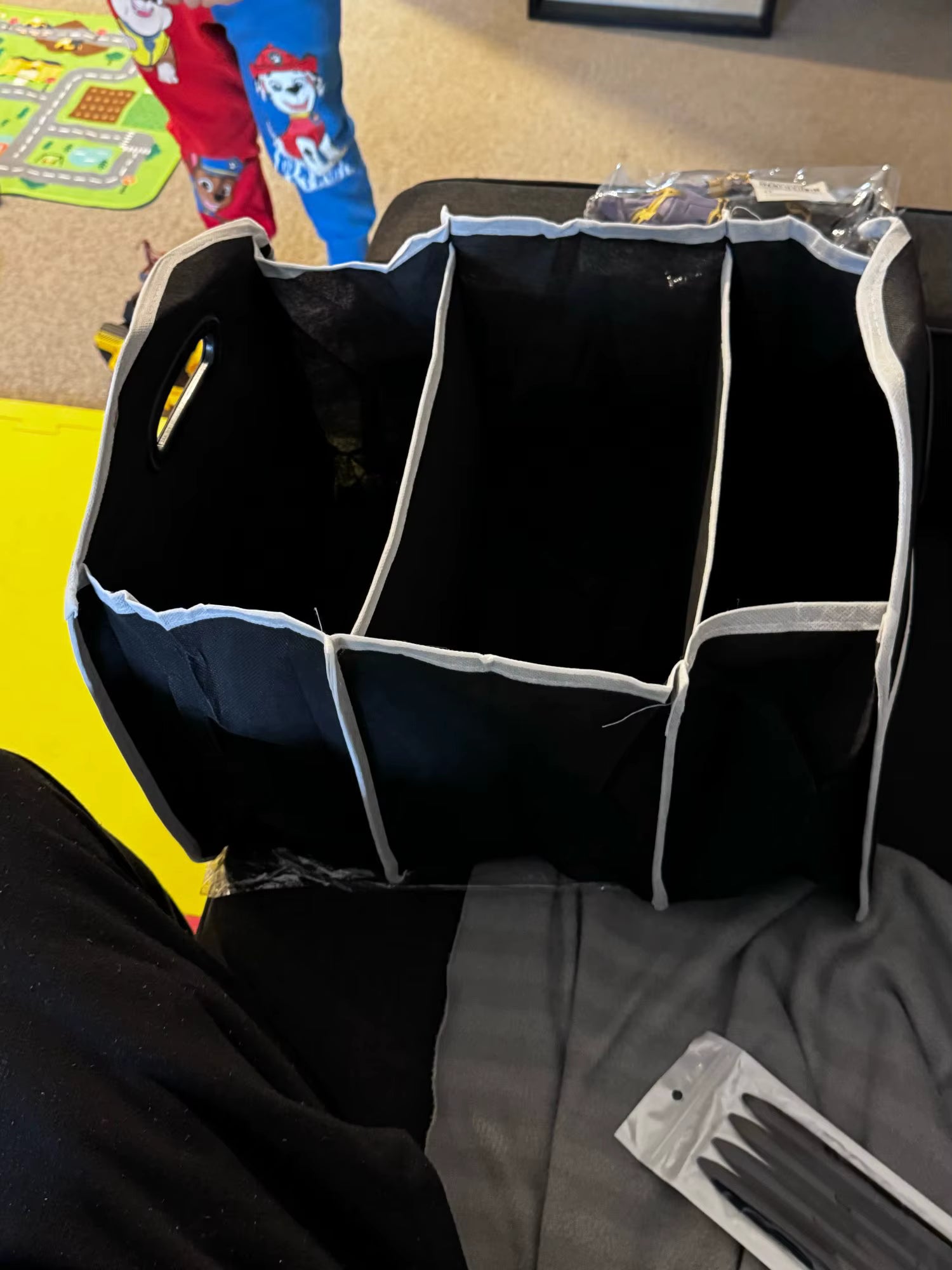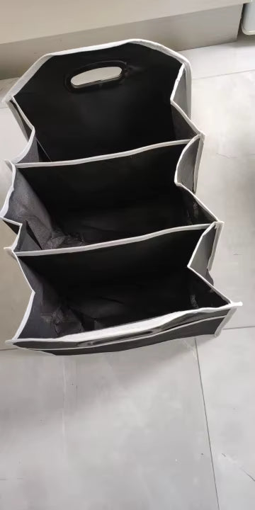 Este organizador cuenta con tres amplios compartimentos ideales para guardar bebidas, frutas, herramientas, ropa o snacks, además de un bolsillo externo perfecto para tus cupones, facturas o accesorios pequeños.